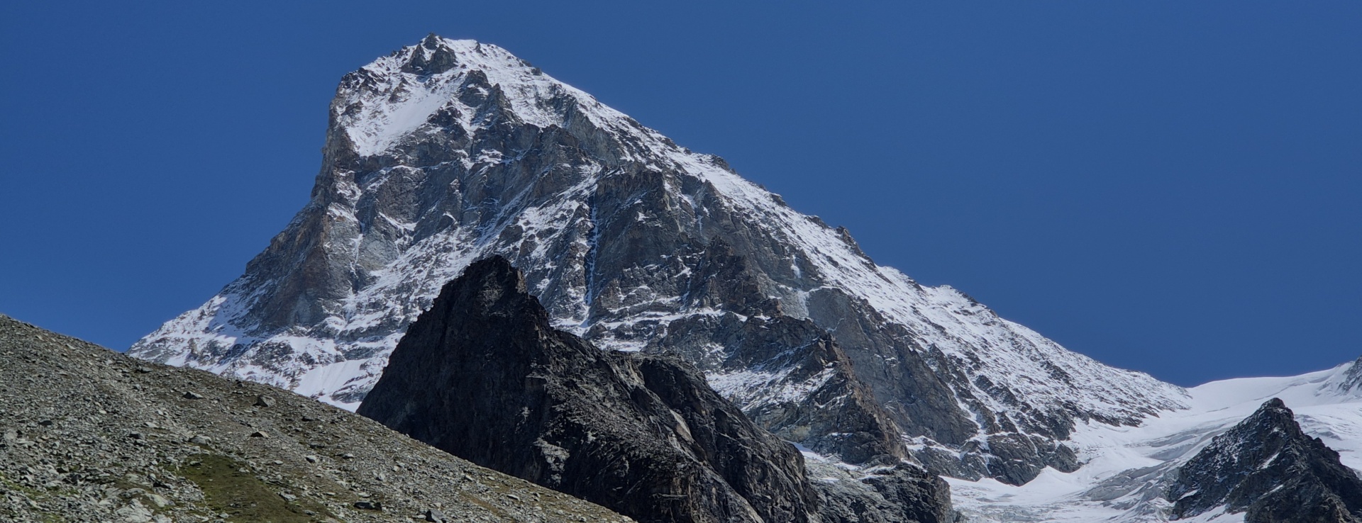 Die Dent Blanche dominiert den zentralen Bereich der Walliser Alpen, ein mächtiges Felsenhorn, das vor allem beim Blick von Westen sofort ins Auge sticht. Wir besteigen den Berg von seiner West- und Südseite, der Ausgangspunkt ist Ferpècle im Val d‘ Herens, welches bei Sion in das Rhonetal mündet. Der lange Hüttenzustieg zur Cabane de la Dent Blanche (4 bis 5 Stunden) wird mit dem relativ kurzen Gipfelanstieg über den Wandfluegrat ausgeglichen.